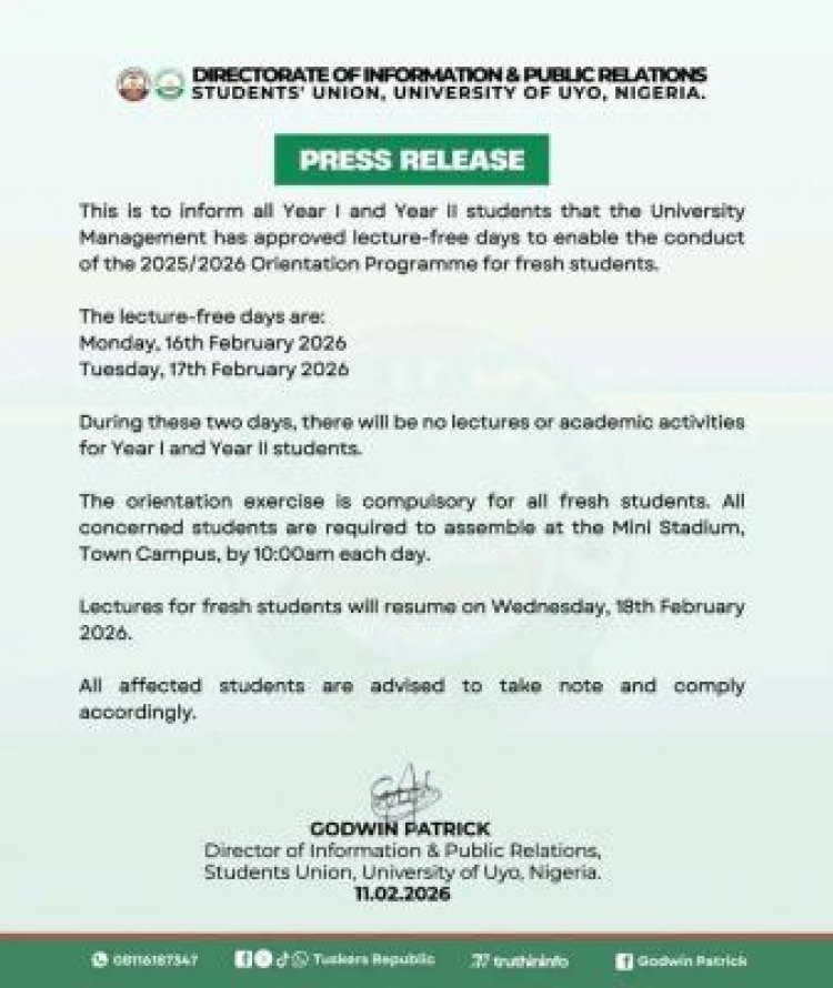 The Student Union Government (SUG) of the University of Uyo (UNIUYO) has mandated that all students and student associations must notify the Directorate of Health, Environment & Welfare before organizing any health-related activities.