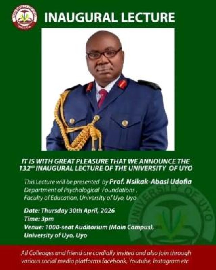 The University of Uyo (UNIUYO) has announced that its 132nd Inaugural Lecture will take place as part of its ongoing commitment to academic excellence, intellectual discourse, and the dissemination of scholarly research.