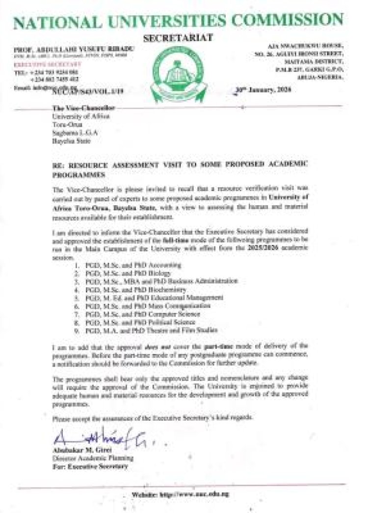 The National Universities Commission (NUC) has formally approved the commencement of several postgraduate programmes at the University of Africa, Toru-Orua (UAT), Bayelsa State, effective from the 2025/2026 academic session.
