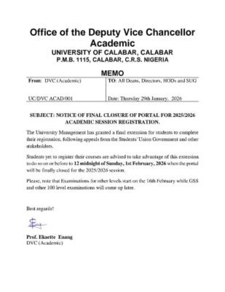 The University of Calabar (UNICAL) has issued a final notice for students to complete their registration for the 2025/2026 academic session, following an approved extension by the Deputy Vice-Chancellor (Academic), Prof. Ekaette Enang, in response to appeals from the Students’ Union Government (SUG) and other stakeholders