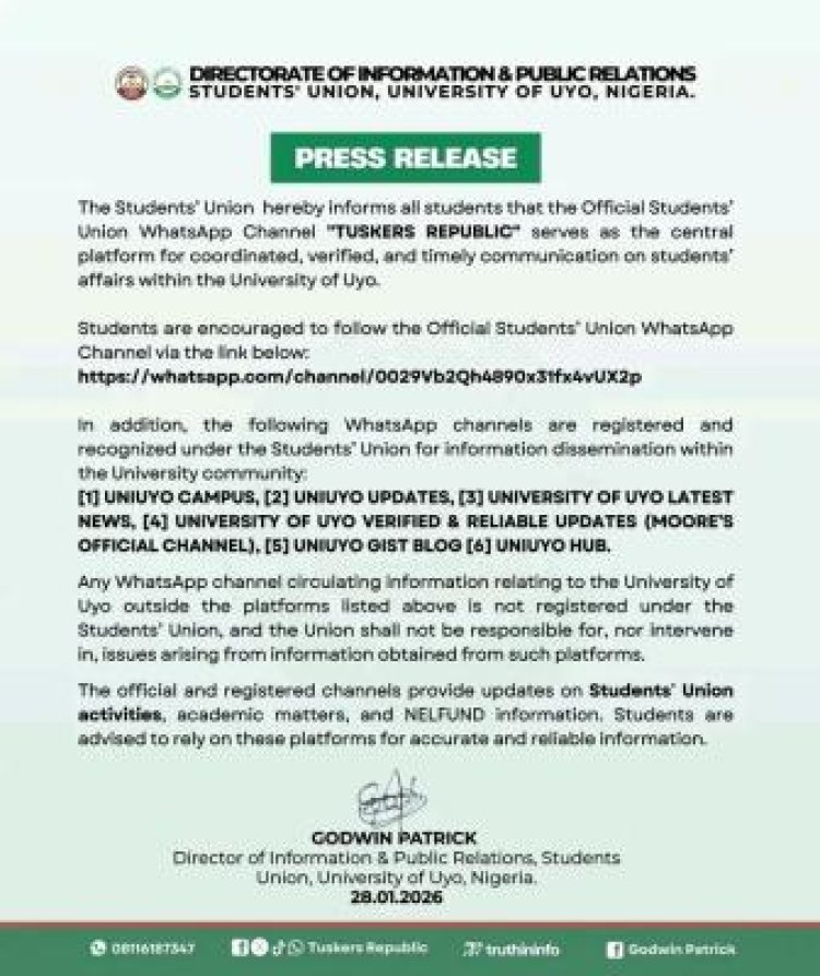 The Students’ Union Government (SUG), University of Uyo, through its Directorate of Information and Public Relations, has released an official guide outlining verified communication platforms for the dissemination of accurate and timely information to students.