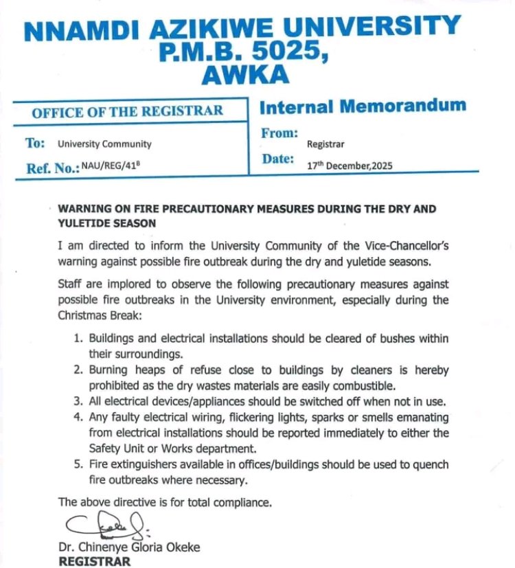 The management of Nnamdi Azikiwe University (UNIZIK), Awka, has issued a formal warning to members of the university community over the heightened risk of fire outbreaks during the dry season and the yuletide period.