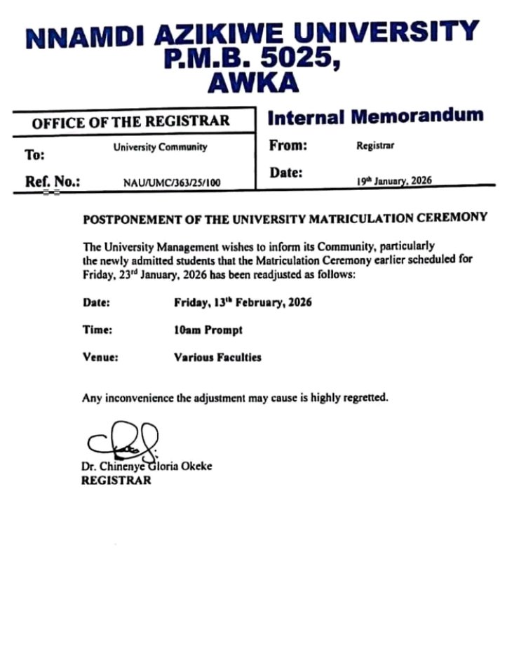 The University of Nigeria, Nsukka (UNIZIK) wishes to inform the university community, especially newly admitted students, that the matriculation ceremony originally scheduled for Friday, 23rd January 2026 has been rescheduled as follows: