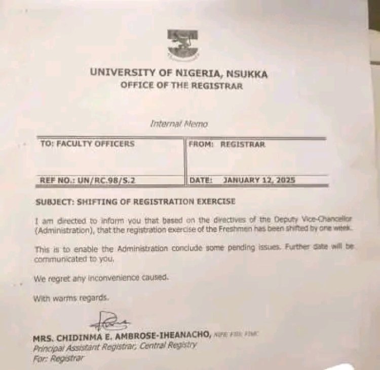The University of Nigeria, Nsukka (UNN) has announced a one-week postponement of the registration exercise for newly admitted students for the 2025/2026 academic session.