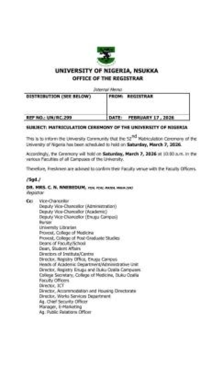 The University of Nigeria (UNN) has announced that its 52nd Matriculation Ceremony for newly admitted students will hold on Saturday, 7th March 2026, starting at 10:00 a.m.