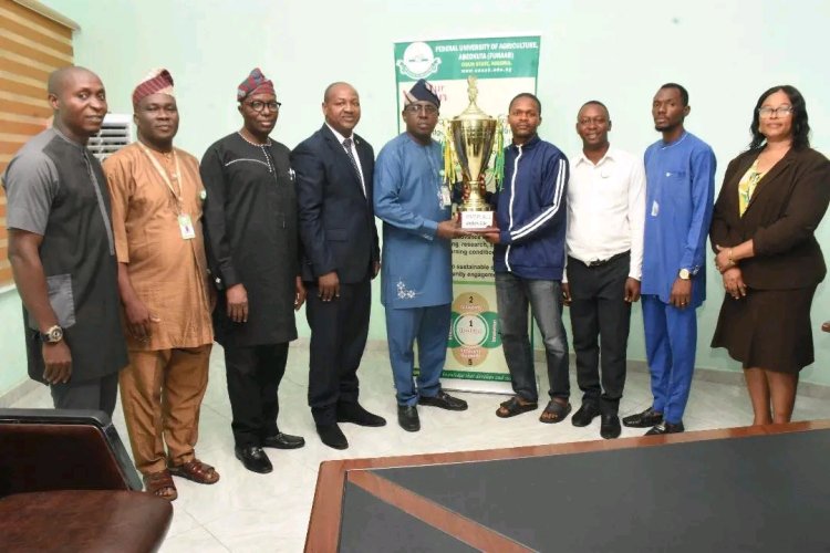 The Office of the Vice-Chancellor, Federal University of Agriculture, Abeokuta (FUNAAB), on July 23, 2025, proudly presented their trophy and medals to the Vice-Chancellor, Prof. Babatunde Kehinde, following their emergence as the Overall Best Team at the 2025 FUNAAB Staff Unity Games.