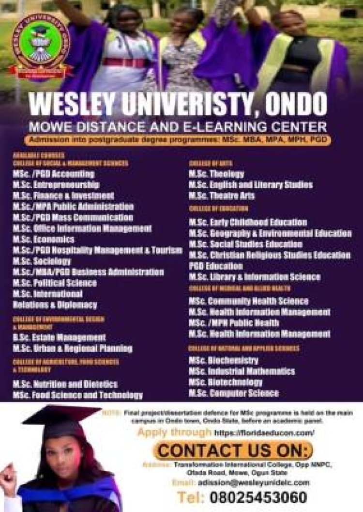 Wesley University, Ondo, through its Mowe Distance and E-Learning Center, invites qualified candidates to apply for admission into its postgraduate programmes, including MSc, MBA, MPA, MPH, and PGD.